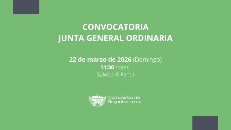 En cumplimiento de lo dispuesto en las Ordenanzas de la Comunidad de Regantes de Lorca y por acuerdo de Junta de Gobierno de fecha 25-09-2025, se convoca